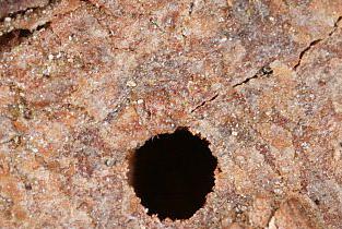 Imago | Imago | Imago, frisch geschlüpft | Imago, dorsal | Imago mit Milbe | Imago mit Milben | Imago, Unterseite | Larve | Fraßgänge | Austrittsloch | Fraßgänge |
