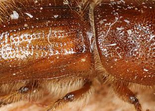 Imago | Imago | Imago, frisch geschlüpft | Imago, dorsal | Imago mit Milbe | Imago mit Milben | Imago, Unterseite | Larve | Fraßgänge | Austrittsloch | Fraßgänge |