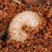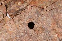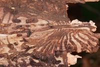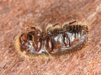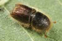 Imago | Imago | Imago, frisch geschlüpft | Imago, dorsal | Imago mit Milbe | Imago mit Milben | Imago, Unterseite | Larve | Fraßgänge | Austrittsloch | Fraßgänge |